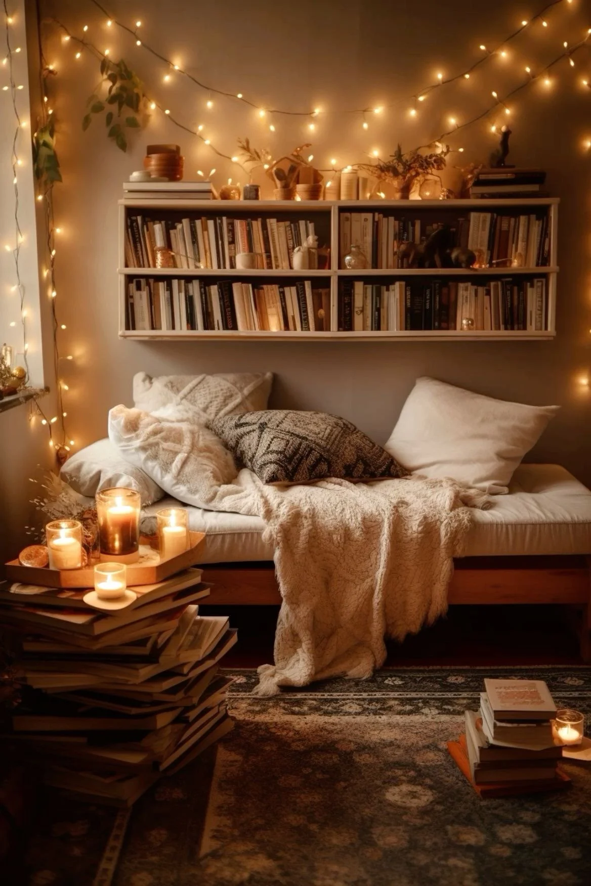 Fall in love with reading and writing in this lovely little space - surrounded by soft and simple lighting, cozy pillows, and books.
